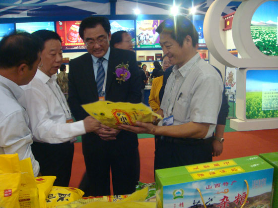 (郭迎光副省长莅临展区指导工作时听取裴海平介绍“黄安”牌小杂粮系列产品)